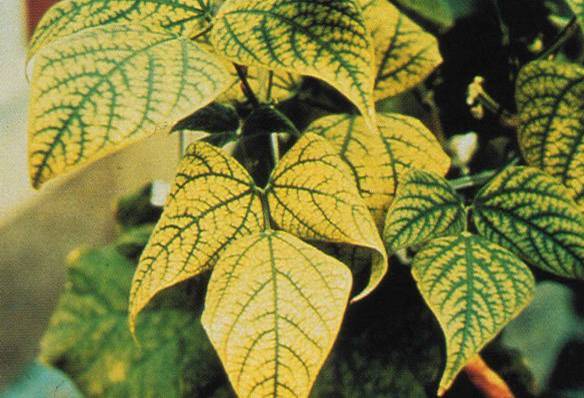 ii. Speckled yellows of sugar beet: In this interveinal areas of sugar beet develop yellowish-green chlorotic mottled areas. The chlorotic areas turn into necrotic zones resulting into breaking of lamina. The leaf margins of such leaves roll upwards and turn into triangular or an arrow-shaped outline which remain upright.