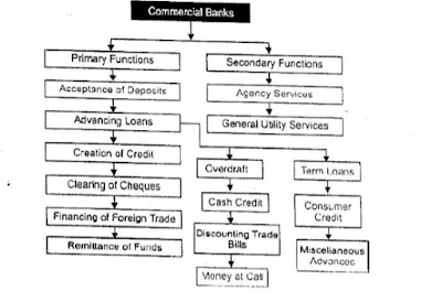 Commercial banks have to perform a variety of functions that are common to both developed and developing countries. These are known as `General Banking’ functions of the commercial banks. The modern banks perform a variety of functions. These can be broadly divided into two categories: (a) Primary functions and (b) Secondary functions.