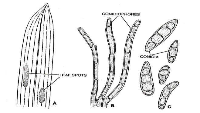 The symptoms appear as small, yellowish, round or oval spots on the leaves. These extends along the leaf and coalesce into longitudinal bands, which may cover a great part of the leaf. The affected tissue gradually become dark in coloured and are being covered in moist weather with velvety dark- green patches due to the fructification of the fungus. Ultimately leaves are dried up and have a blighted appearence. The plants remain stunted and the ears poorly developed.