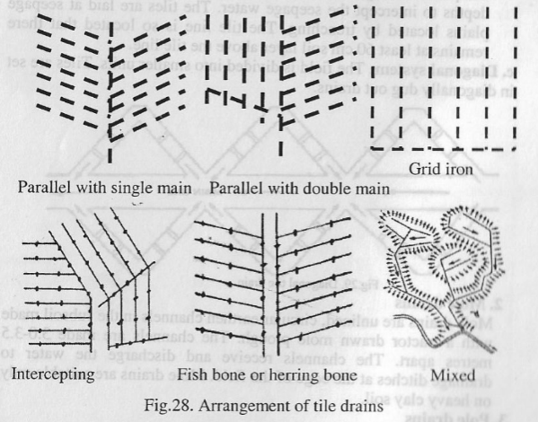 The tile made of clay or concrete pipe or perforated steel pipes are mostly used for tile drains. The tile is about 30 to 50 cm in length and 7 to 12 cm in diameter. The tiles are installed end to end in the field after digging trenches with 2-3 millimeter spacing in the joint. The drains are usually spaced 1.5-45 m apart according to the type of soil. Excess water enters the system through the space in between the two tiles and conveyed along the gradient. Tile drains are grouped in classes depending on the arrangement of tiles:
