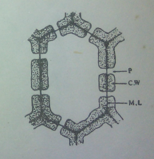 In a bordered pit, the adjoining thickening matter of the wall grows inwards and arches over the pit from all sides, forming an overhanging border, and hence the name ‘bordered’ Pit. Viewed from the surface the simple pit may be circular, oval, polygonal, elongated or somewhat irregular, while the bordered pit is often circular or oval. Pits are areas through which the diffusion of liquids takes place more easily.