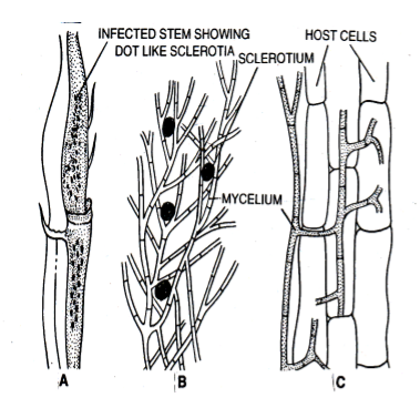 The disease is commonly found in the transplanted crop in the month of July-September. First of all small dark lesions are developed on the outer leaf sheath at the water line. Later on this lesions gradually make their appearance on the inner leaf sheaths and the culm. The affected and numerous small dark brown sclerotia are formed in the tissues of leaf sheath. In later stages, the mycelial mats and the sclerotia are copiously formed inside the culm also. Rotting remains restricted to a few lower internodes. As the plants matured the intensity of infection is increased. The culms collapse and plants lodge heavily, when the infection attackes place later in the growing season the grains are much shrivelled.
