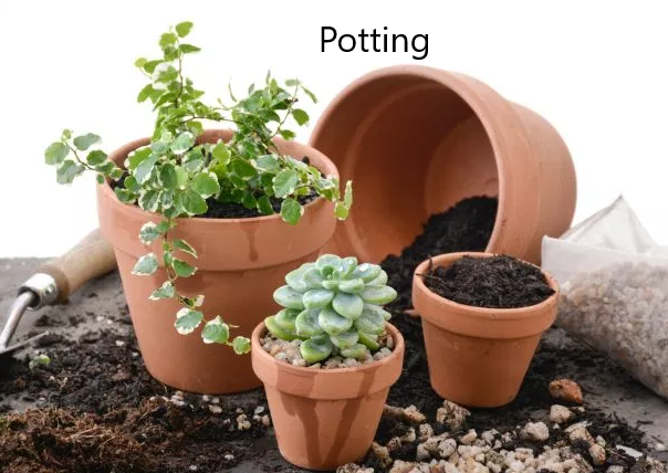 Potting means pot culture for cultivation of plants in pot. High and deep pots are required for potting of plants. A hole is very essential at the bottom of pot for convenient of water removed. Rainy season is very suitable for pot plantation. It also can be done any time of the year.